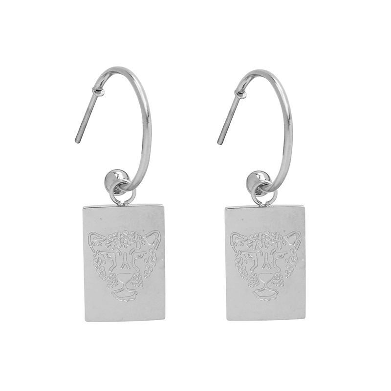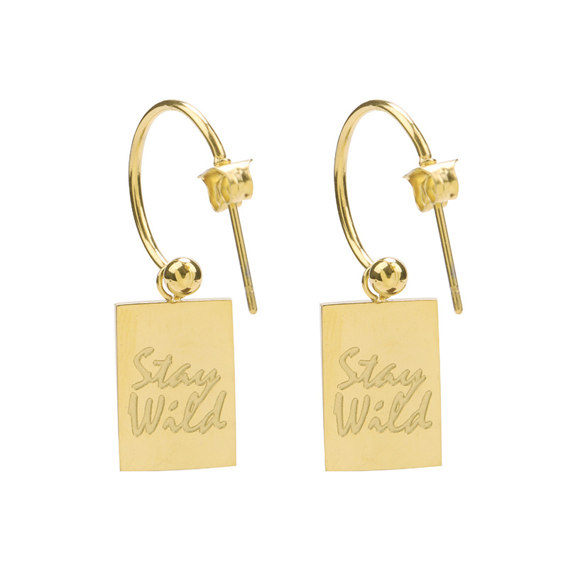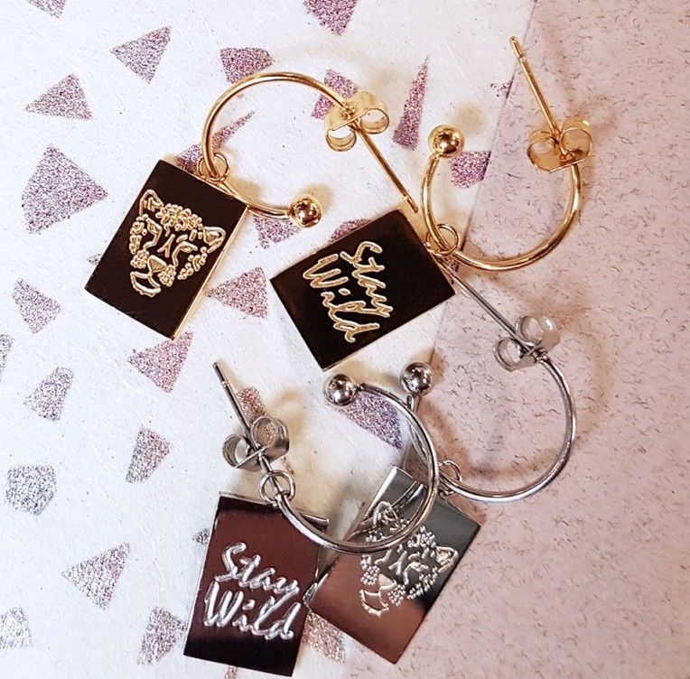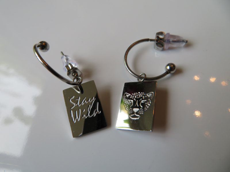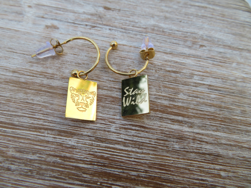 OverzichtEen hele leuke roestvrij stalen oorbel. De bedel heeft twee kanten, één met de afbeelding van een tijger en één met de tekst 'Stay Wild'.