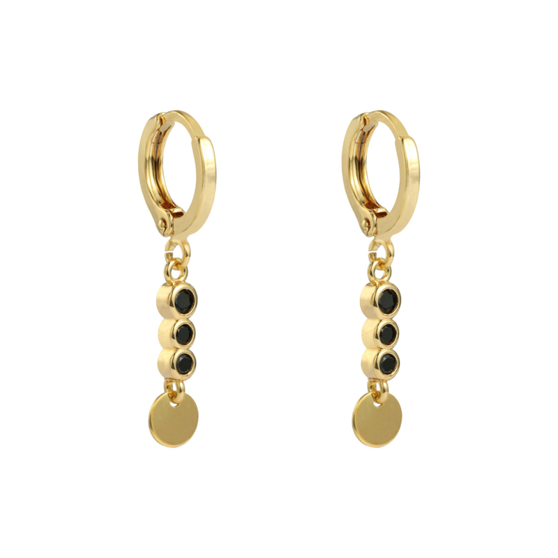 Oorbellen met drie fonkelende stenen en een cirkel.