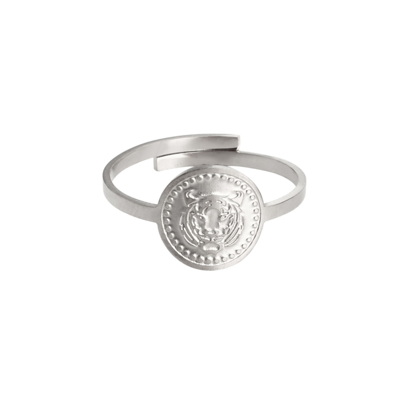 OverzichtVerstelbare roestvrijstalen ring met de afbeelding van een tijger.